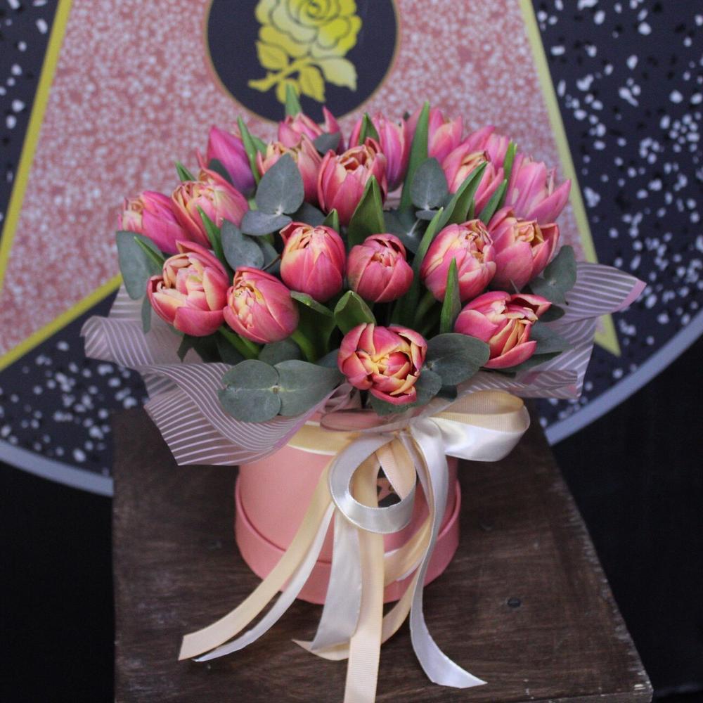тюльпан пионовидный коламбус – 19 шт.Эвкалипт – 2 шт.Пленка дизайнерская – 1 шт.Шляпная коробка – 1 шт.